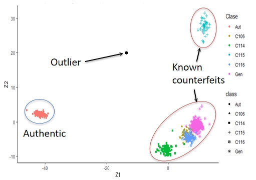 The figure shows clustering using two components of the properties measured in a set of counterfeit notes The groups of dots (except red ones) represent known counterfeit classes One banknote defined as a counterfeit found far away (outlier) could represent a new counterfeit technology trend, an EARLY WARNING!